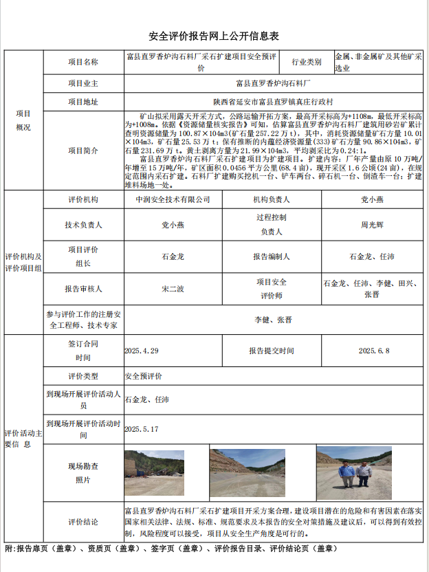 富縣直羅香爐溝石料廠采石擴建項目安全預(yù)評價